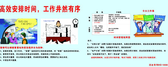 今年工廠的生意一直就很紅火,新老顧客訂單紛至沓來,公司一向以先保障老客戶訂單時間為原則來處理,而滿足不了一些新顧客的訂單時間,這是一件很遺憾的事情。為了服務(wù)好新老顧客的需求,工廠自身也在進行反省和改進。 8月份的黑板報主題就是:高效安排時間,工作井井然有序。相信隨著工廠管理水平的提升,員工時間觀念的加強,生產(chǎn)效率能夠得到逐步得提升,來滿足到更多顧客的需求。事情按重要性和緊急程度可以分為: 1,重要而緊急
